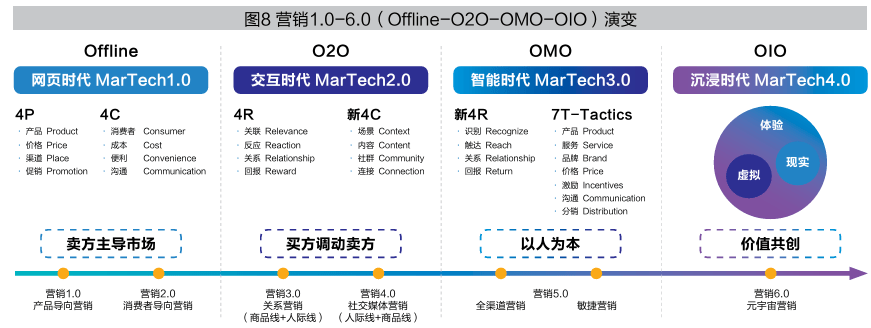 MarTech 4.0阶段即OIO的沉浸时代,营销进入以元宇宙为核心范式的营销6.0。在这个阶段,元宇宙、区块链、VR/AR、AI大模型等技术深度融合,构建出数字与物理空间交织的多感官沉浸式体验环境;同时支持用户参与价值共创与社群治理,营销目标从“交易转化”升级为“用户终身价值最大化”。